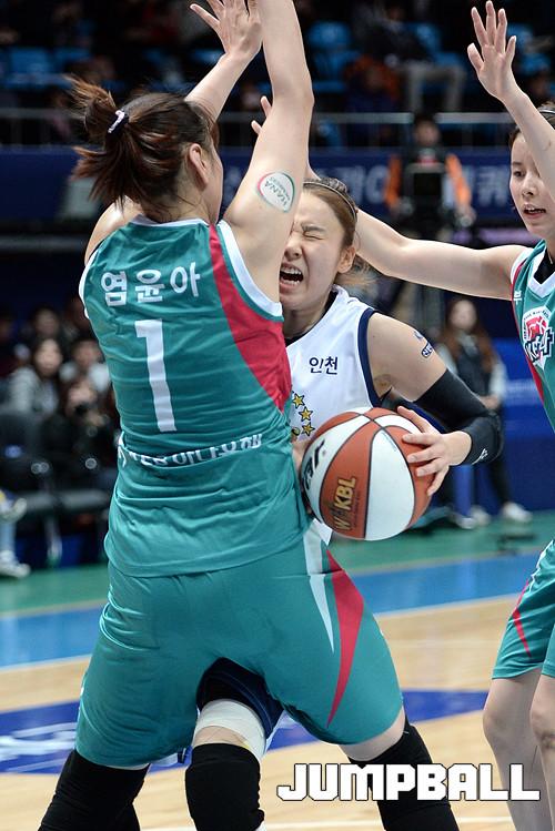 04일 인천 도원체육관에서 열린 'KDB생명 2015-2016 여자프로농구' 인천 신한은행 과 부천 하나외환 의 경기, 돌파를 시도하던 신한은행 최윤아가 하나외환 염윤아의 수비에 막혀 고전을 하고있다.