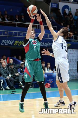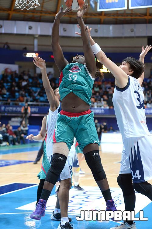 04일 인천 도원체육관에서 열린 'KDB생명 2015-2016 여자프로농구' 인천 신한은행 과 부천 하나외환 의 경기, 하나외환 첼시 리가 신한은행 하은주의 수비를 피해 골밑슛을 시도하고있다.