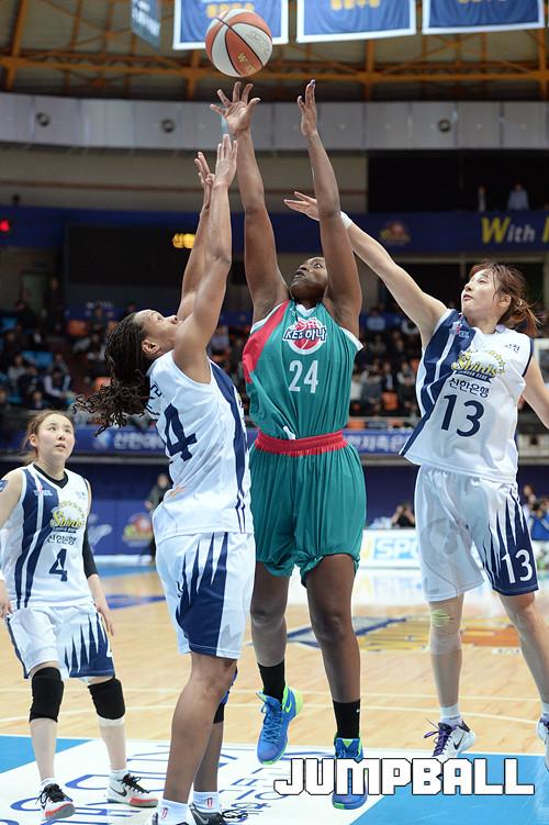 04일 인천 도원체육관에서 열린 'KDB생명 2015-2016 여자프로농구' 인천 신한은행 과 부천 하나외환 의 경기, 하나외환 휴스턴이 신한은행 커리의 수비를 피해 골밑슛을 시도하고있다.