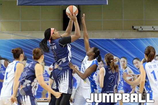 19일 춘천 호반 체육관에서 열린 'KDB생명 2015-2016 여자프로농구' 춘천 우리은행 과 인천 신한은행 의 경기, 신한은행 게이틀링이 우리은행 스트릭렌을 앞에두고 점프슛을 시도하고있다.