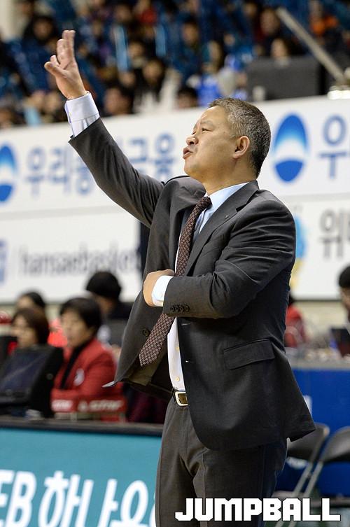 19일 춘천 호반 체육관에서 열린 'KDB생명 2015-2016 여자프로농구' 춘천 우리은행 과 인천 신한은행 의 경기, 신한은행 정인교 감독이 적극적인 공격을 지시하고있다.