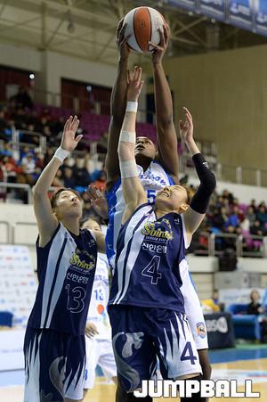 19일 춘천 호반 체육관에서 열린 'KDB생명 2015-2016 여자프로농구' 춘천 우리은행 과 인천 신한은행 의 경기, 신한은행 김규희가 우리은행 양지희의 공을 스틸하고있다.
