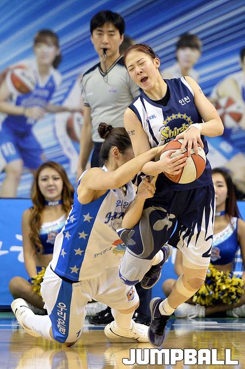 19일 춘천 호반 체육관에서 열린 'KDB생명 2015-2016 여자프로농구' 춘천 우리은행 과 인천 신한은행 의 경기, 스틸을 성공시킨 신한은행 김규희의 팔을 우리은행 양지희가 잡아당기고있다.