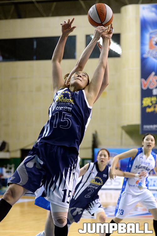 19일 춘천 호반 체육관에서 열린 'KDB생명 2015-2016 여자프로농구' 춘천 우리은행 과 인천 신한은행 의 경기, 신한은행 신정자가 우리은행 박혜진과 리바운드를 다투고있다.