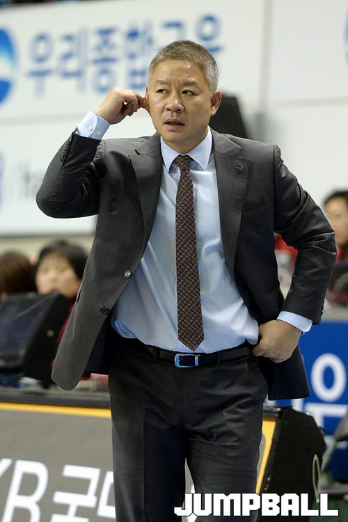 19일 춘천 호반 체육관에서 열린 'KDB생명 2015-2016 여자프로농구' 춘천 우리은행 과 인천 신한은행 의 경기, 신한은행 정인교 감독이 뒤를 잡아당기며 작전을 지시하고있다.