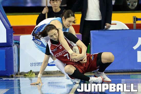 07일 용인 실내체육관에서 열린 'KDB생명 2015-2016 여자프로농구' 용인 삼성생명 과 구리 KDB생명 의 경기, 삼성생명 박하나가 KDB생명 한채진과 볼다툼을 벌이고있다.