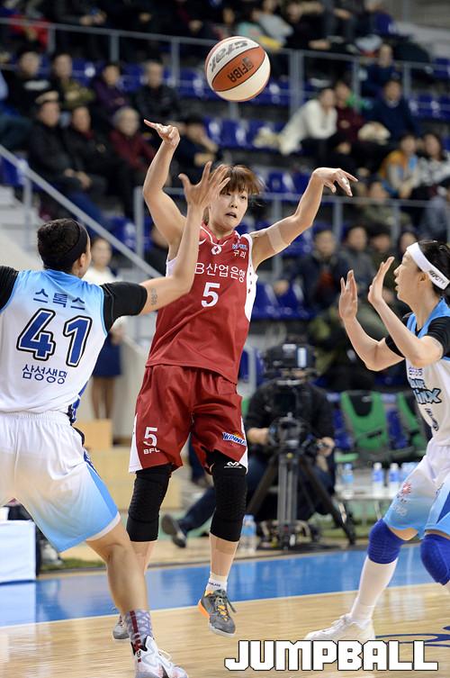 07일 용인 실내체육관에서 열린 'KDB생명 2015-2016 여자프로농구' 용인 삼성생명 과 구리 KDB생명 의 경기, KDB생명 이경은이 삼성생명 이미선, 스톡스의 수비를 피해 패스를 해주고있다.