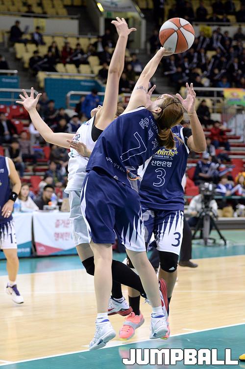 08일 부천 실내체육관에서 열린 'KDB생명 2015-2016 여자프로농구' 부천 KEB하나은행 과 인천 신한은행 의 경기, 신한은행 윤미지가 KEB하나은행 김이슬과 리바운드를 다투고있다.