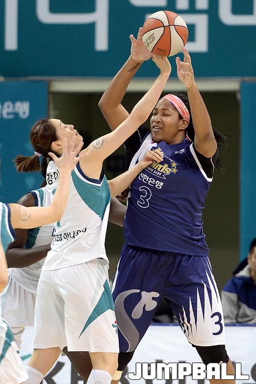 08일 부천 실내체육관에서 열린 'KDB생명 2015-2016 여자프로농구' 부천 KEB하나은행 과 인천 신한은행 의 경기, KEB하나은행 강이슬이 신한은행 게이틀링의 패스를 가로채기 하고고있다.