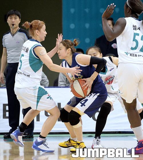 08일 부천 실내체육관에서 열린 'KDB생명 2015-2016 여자프로농구' 부천 KEB하나은행 과 인천 신한은행 의 경기, 신한은행 최윤아가 KEB하나은행 김이슬, 염윤아의 수비에 걸려 고전을 하고있다.