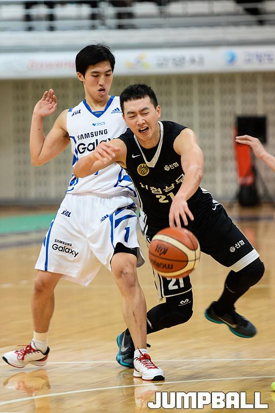 [점프볼=고양/유용우 기자] 11일 고양 실내보조체육관에서 열린 '2015-2016 KBL D리그' 신협 상무와 서울 삼성의 4강 경기, 삼성 최수현의 수비를 피해 상무 성재준이 돌파를 시도하고 있다.