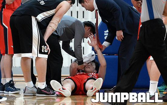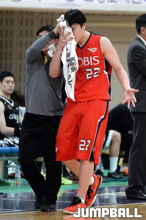 | 12일 고양 실내보조체육관에서 열린 '2015-2016 KBL D리그' 신협상무와 울산모비스의 결승전, 모비스 박봉진이 상대선수와 볼다툼을 하다 눈가를 다쳐 코트를 벗어나고있다. |