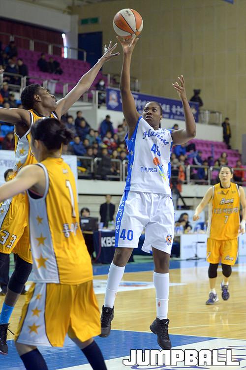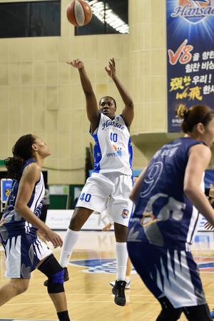 07일 춘천 호반체육관에서 열린 'KDB생명 2015-2016 여자프로농구' 춘천 우리은행 과 청주 KB 의 경기, 우리은행 스트릭렌이 KB 하워드의 수비를 피해 점프슛을 시도하고있다.