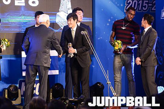 [점프볼=서초/유용우 기자] 22일 JW 메리어트호텔에서 열린 '2015-2016 KCC 프로농구 시상식 ', 수비 5걸상을 수상하고 있다. 수상자 명단 : KGC 양희종,오리온 이승현, 삼성 라틀리프,KCC 신명호, 모비스 양동근.
