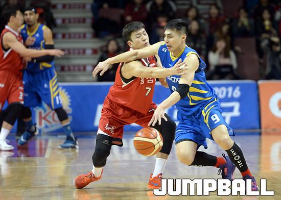 25일 안양 실내체육관에서 열린 '2015-2016 KCC 프로농구' 6강 플레이오프 안양 KGC 와 서울 삼성 의 1차전 경기, 삼성 주희정의 돌파를 KGC 박찬희가 막아서고있다.