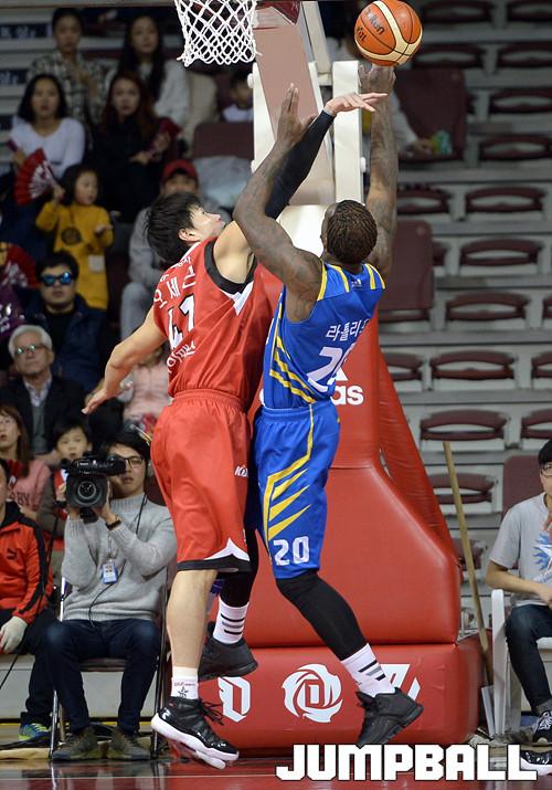 25일 안양 실내체육관에서 열린 '2015-2016 KCC 프로농구' 6강 플레이오프 안양 KGC 와 서울 삼성 의 1차전 경기, KGC 오세근이 삼성 라틀리프의 슛을 블록하고있다.