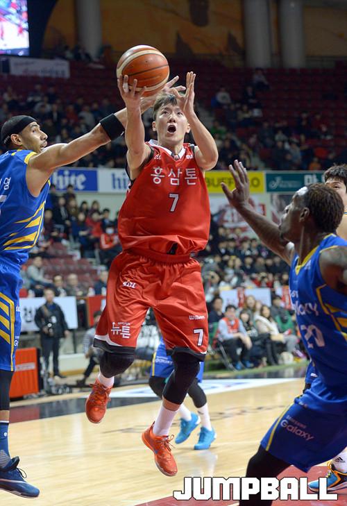 25일 안양 실내체육관에서 열린 '2015-2016 KCC 프로농구' 6강 플레이오프 안양 KGC 와 서울 삼성 의 1차전 경기, KGC 박찬희가 삼성 문태영의 수비를 제치고 골밑슛을 시도하고있다.