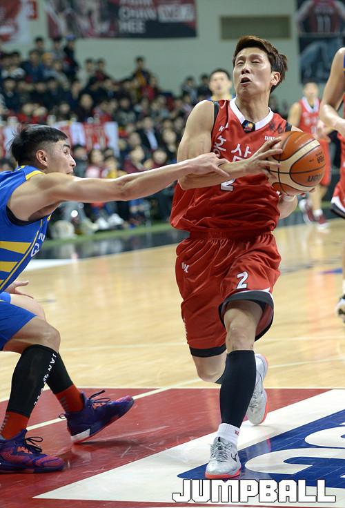 25일 안양 실내체육관에서 열린 '2015-2016 KCC 프로농구' 6강 플레이오프 안양 KGC 와 서울 삼성 의 1차전 경기, KGC 박찬희의 돌파를 삼성 주희정이 파울로 막아서고있다.