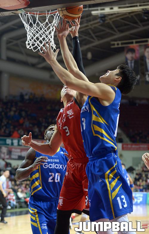27일 안양 실내체육관에서 열린 '2015-2016 KCC 프로농구' 6강 플레이오프 안양 KGC 와 서울 삼성 의 2차전 경기, KGC 이정현이 삼성 임동섭의 수비를 피해 팁인슛을 시도하고있다.