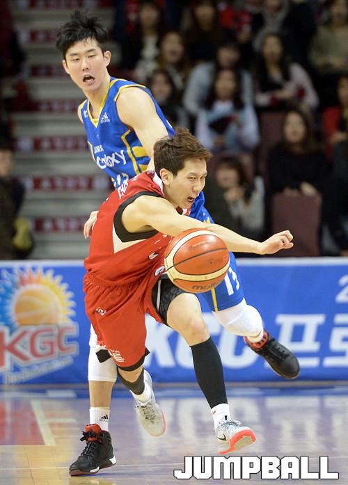 27일 안양 실내체육관에서 열린 '2015-2016 KCC 프로농구' 6강 플레이오프 안양 KGC 와 서울 삼성 의 2차전 경기, KGC 김기윤이 삼성 임동섭과 볼다툼을 하고있다.