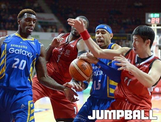 27일 안양 실내체육관에서 열린 '2015-2016 KCC 프로농구' 6강 플레이오프 안양 KGC 와 서울 삼성 의 2차전 경기, KGC 찰스로드, 양희종과 삼성 라틀리프, 문태영이 리바운드를 다투고있다.