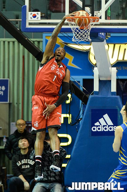 [점프볼=잠실/유용우 기자] 29일 잠실 실내체육관에서 열린 '2015-2016 KCC 프로농구' 서울 삼성과 안양 KGC 인삼공사의 플레이오프 3차경기, KGC 찰스 로드가 백덩크를 성공하고 있다.