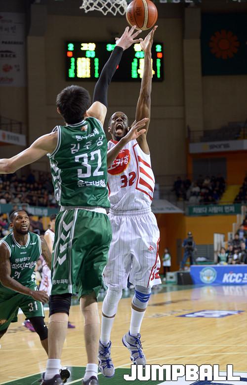 01일 원주 실내체육관에서 열린 '2015-2016 KCC 프로농구' 6강 플레이오프 원주 동부 와 고양 오리온 의 3차전 경기, 오리온 헤인즈가 동부 김주성의 수비를 피해 골밑슛을 시도하고있다.