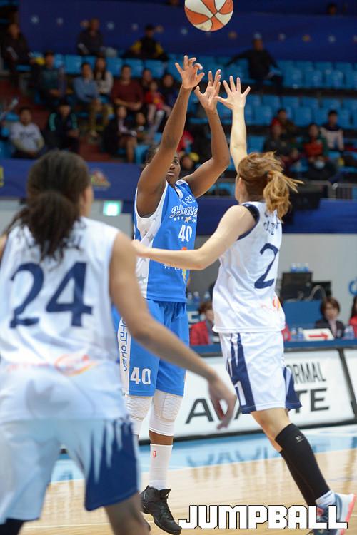 02일 인천 도원체육관에서 열린 'KDB생명 2015-2016 여자프로농구' 인천 신한은행 과 춘천 우리은행 의 경기, 우리은행 스트릭렌이 신한은행 이민지의 수비를 피해 점프슛을 시도하고있다.