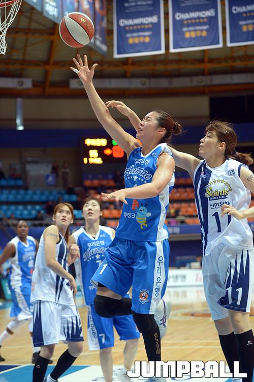 02일 인천 도원체육관에서 열린 'KDB생명 2015-2016 여자프로농구' 인천 신한은행 과 춘천 우리은행 의 경기, 우리은행 양지희가 신한은행 양인영희 수비를 제치고 골밑슛을 시도하고있다.