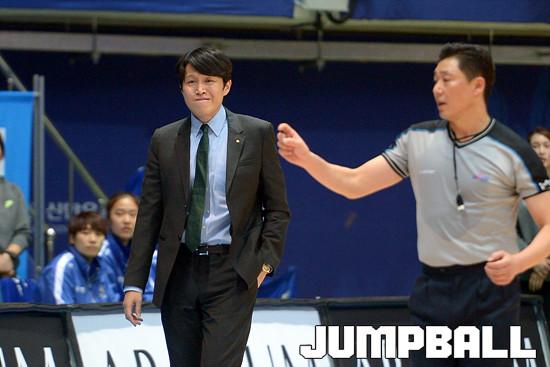 02일 인천 도원체육관에서 열린 'KDB생명 2015-2016 여자프로농구' 인천 신한은행 과 춘천 우리은행 의 경기, 우리은행 위성우 감독이 입술을 깨물며 못마땅한 표정으로 경기를 지켜보고있다.