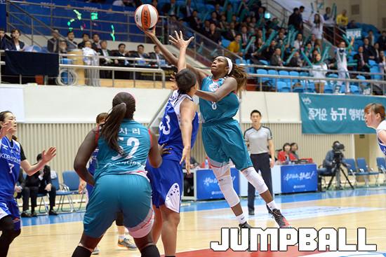 03일 구리 실내체육관에서 열린 'KDB생명 2015-2016 여자프로농구' 구리 KDB생명 과 부천 하나은행 의 경기, 하나은행 모스비가 KDB생명 플레넷의 수비를 제치고 골밑슛을 시도하고있다.