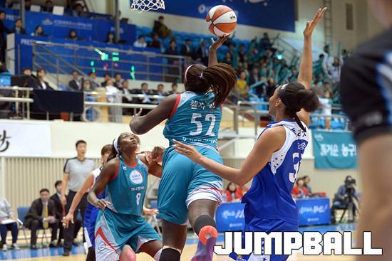 03일 구리 실내체육관에서 열린 'KDB생명 2015-2016 여자프로농구' 구리 KDB생명 과 부천 하나은행 의 경기, 하나은행 첼시 리가 KDB생명 플레넷의 수비를 제치고 골밑슛을 시도하고있다.