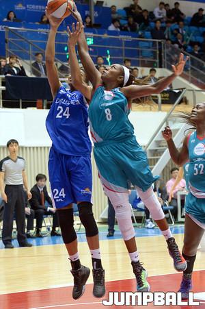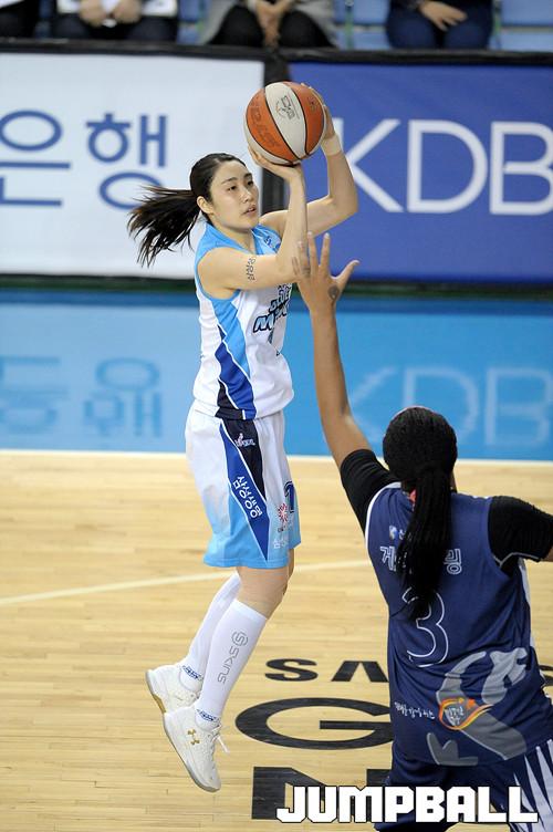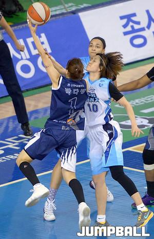 04일 용인 실내체육관에서 열린 'KDB생명 2015-2016 여자프로농구' 용인 삼성생명 과 인천 신한은행 의 경기, 삼성생명 박하나가 신한은행 게이틀링의 수비를 피해 점프슛을 시도하고있다.