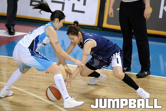 04일 용인 실내체육관에서 열린 'KDB생명 2015-2016 여자프로농구' 용인 삼성생명 과 인천 신한은행 의 경기, 신한은행 박다정이 삼성생명 박하나와 볼다툼을 벌이고있다.