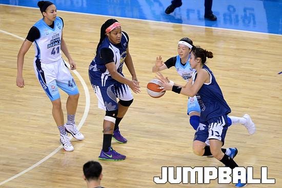 04일 용인 실내체육관에서 열린 'KDB생명 2015-2016 여자프로농구' 용인 삼성생명 과 인천 신한은행 의 경기, 신한은행 게이틀링이 삼성생명 이미선의 수비를 피해 김단비에게 패스를 해주고있다.
