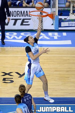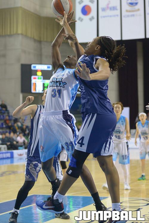 04일 용인 실내체육관에서 열린 'KDB생명 2015-2016 여자프로농구' 용인 삼성생명 과 인천 신한은행 의 경기, 삼성생명 테일러가 신한은행 커리와 리바운드를 다투고있다.