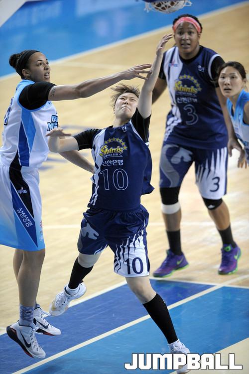 04일 용인 실내체육관에서 열린 'KDB생명 2015-2016 여자프로농구' 용인 삼성생명 과 인천 신한은행 의 경기, 신한은행 박혜미가 삼성생명 테일러의 수비를 제치고 골밑슛을 시도하고있다.