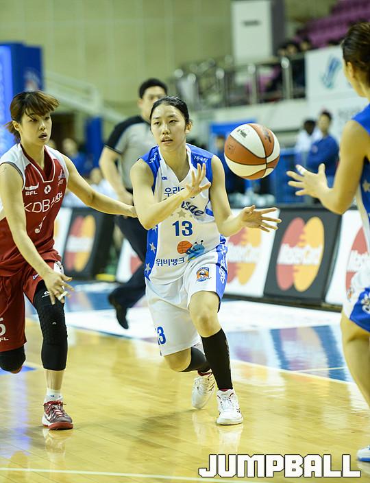 [점프볼=춘천/유용우 기자] 5일 춘천 호반체육관에서 열린 'KDB생명 2015-2016 여자프로농구' 춘천 우리은행과 구리 KDB생명의 경기, 우리은행 이승아가 패스를 내주고 있다.
