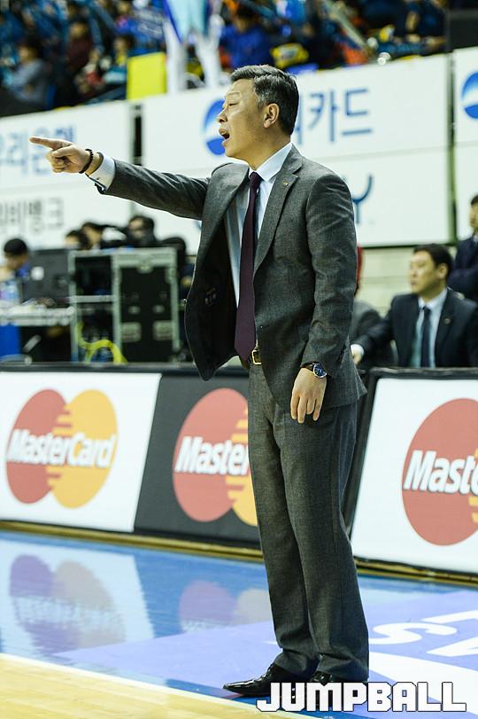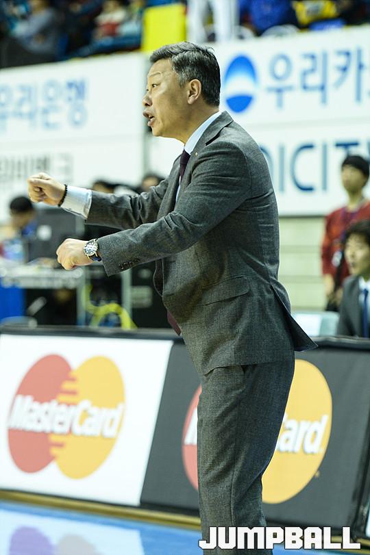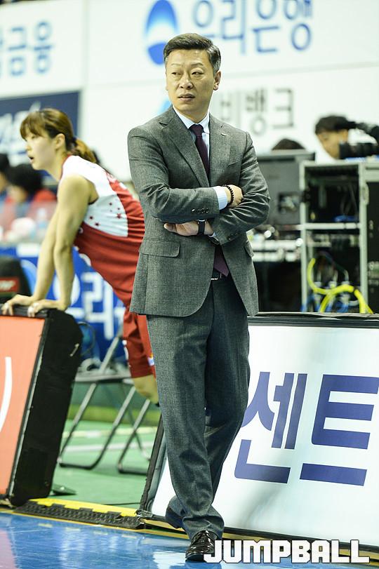 [점프볼=춘천/유용우 기자] 5일 춘천 호반체육관에서 열린 'KDB생명 2015-2016 여자프로농구' 춘천 우리은행과 구리 KDB생명의 경기, KDB생명 김영주 감독이 경기를 지켜보고 있다.