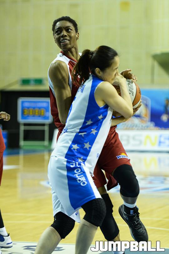 [점프볼=춘천/유용우 기자] 5일 춘천 호반체육관에서 열린 'KDB생명 2015-2016 여자프로농구' 춘천 우리은행과 구리 KDB생명의 경기, KDB생명 비키의 돌파를 우리은행 이은혜가 수비하고 있다.