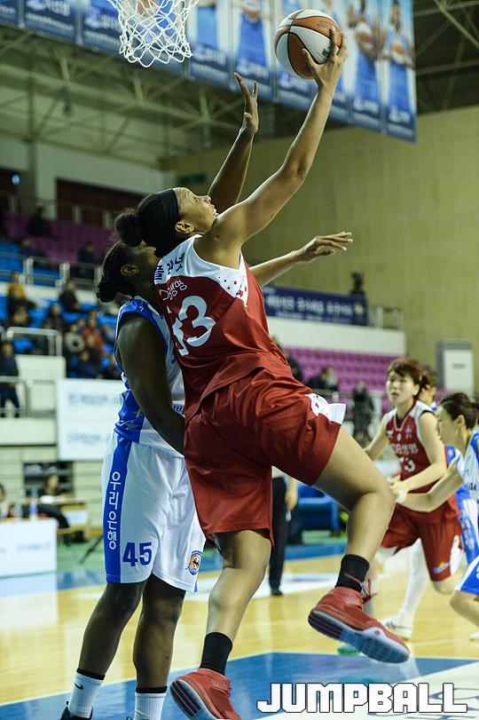 [점프볼=춘천/유용우 기자] 5일 춘천 호반체육관에서 열린 'KDB생명 2015-2016 여자프로농구' 춘천 우리은행과 구리 KDB생명의 경기, KDB생명 플레넷이 리버스레이업으로 득점을 성공시키고 있다.