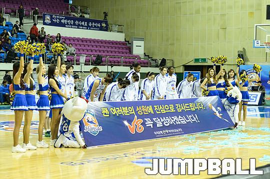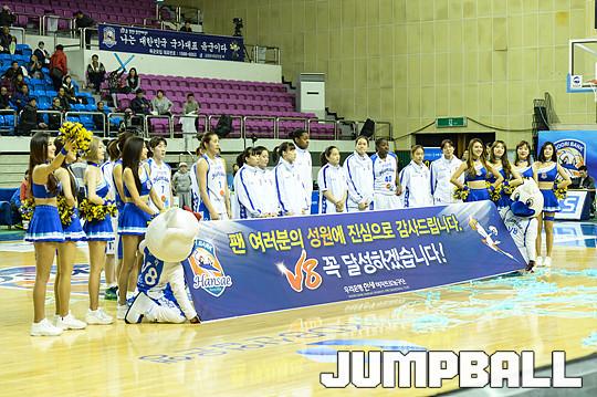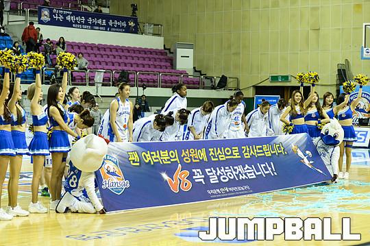 [점프볼=춘천/유용우 기자] 5일 춘천 호반체육관에서 열린 'KDB생명 2015-2016 여자프로농구' 춘천 우리은행과 구리 KDB생명의 경기, 우리은행 선수단이 팬들에게 V6 달성을 약속하며 인사하고 있다.