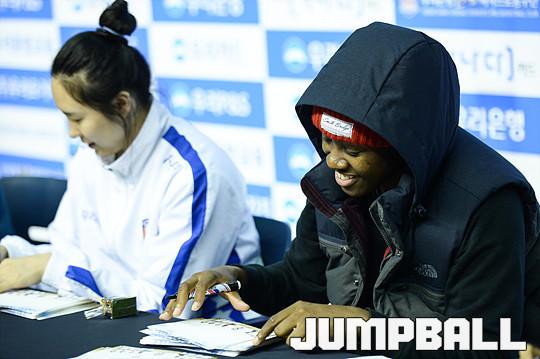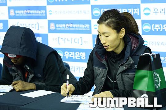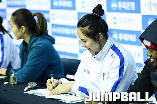 [점프볼=춘천/유용우 기자] 5일 춘천 호반체육관에서 열린 'KDB생명 2015-2016 여자프로농구' 춘천 우리은행과 구리 KDB생명의 경기, 우리은행 선수단이 경기를 마치고 홈팬들을 위한 싸인회에 임하고 있다.
