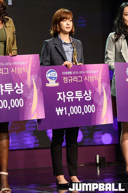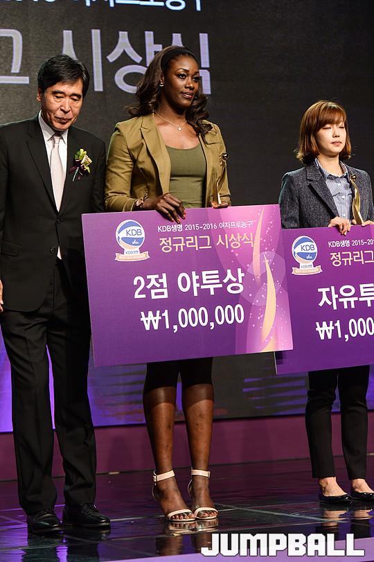 [점프볼=여의도/유용우 기자] 7일 여의도 컨벤션센터 2층 그랜드볼룸에서 열린 'KDB생명 2015-2016 여자프로농구 정규리그 시상식' KEB하나은행 첼시 리-2점 야투상, KDB생명 이경은-자유투상, KB스타즈 변연하-어시스트상등 각 부분 수상을 하고 있다.