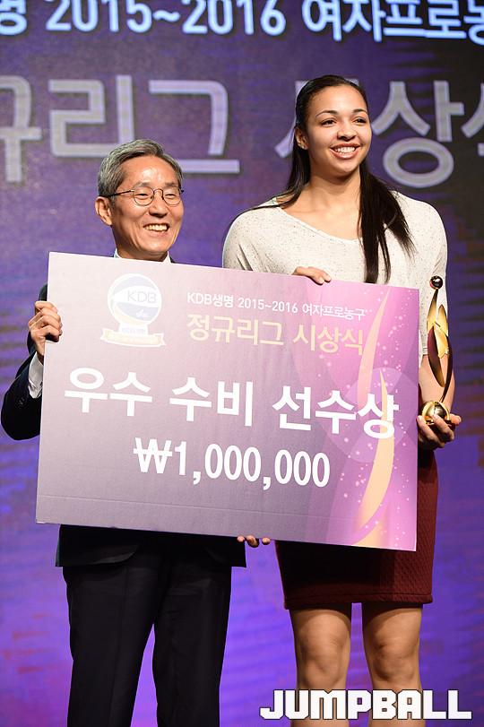[점프볼=여의도/유용우 기자] 7일 여의도 컨벤션센터 2층 그랜드볼룸에서 열린 'KDB생명 2015-2016 여자프로농구 정규리그 시상식' 삼성생명 스톡스가 우수수비선수상을 수상받고 있다.
