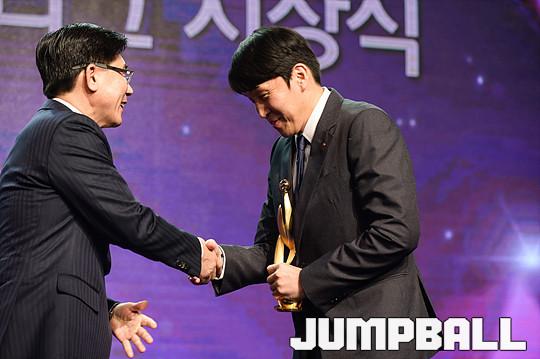[점프볼=여의도/유용우 기자] 7일 여의도 컨벤션센터 2층 그랜드볼룸에서 열린 'KDB생명 2015-2016 여자프로농구 정규리그 시상식' 우리은행 위성우 감독이 지도자상을 수상하고 있다.