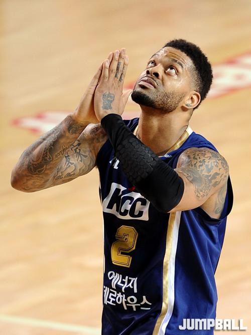 07일 전주 실내체육관에서 열린 '2015-2016 KCC 프로농구' 4강 플레이오프 전주 KCC 와 안양 KGC 의 1차전 경기, KCC 에밋이 잠시 기도를 하고 있다.