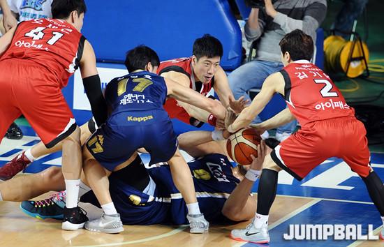 07일 전주 실내체육관에서 열린 '2015-2016 KCC 프로농구' 4강 플레이오프 전주 KCC 와 안양 KGC 의 1차전 경기, KCC 하승진이 몸을 사리지않고 루즈볼 경쟁을 펼치고 있다.