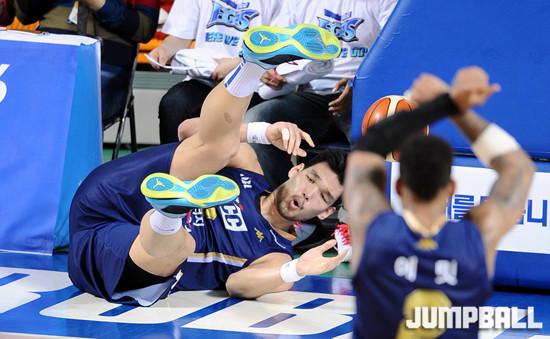 07일 전주 실내체육관에서 열린 '2015-2016 KCC 프로농구' 4강 플레이오프 전주 KCC 와 안양 KGC 의 1차전 경기, KCC 하승진이 공격을 시도하다 상대의 파울로 넘어저서 즐거운 표정을 짓고 있다.