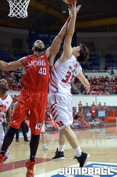 08일 울산 동천체육관에서 열린 '2015-2016 KCC 프로농구' 4강 플레이오프 울산 모비스 와 고양 오리온 의 1차전 경기, 오리온 이승현이 모비스 클라크와 리바운드를 다투고있다.